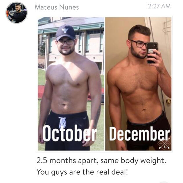Another example: we guaranteed Mateus we would add at least 6lbs of lean mass in 12 weeks if he followed our guidelines. If not, we would work with him until he did.Mateus went on to make this complete body transformation where he gained lean mass BUT also lost fat.
